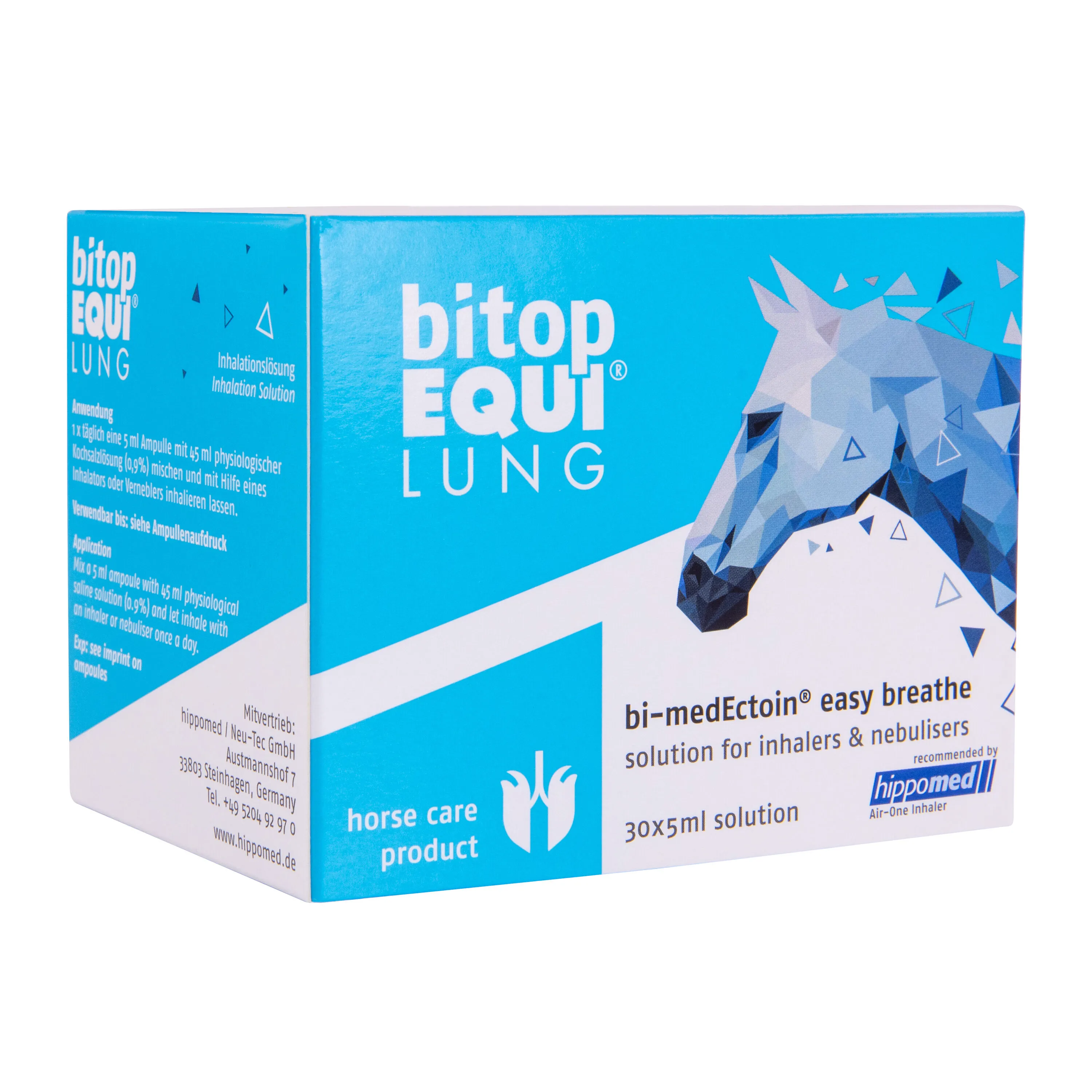 bi-medEctoin® ist ein Pflegemittel für Pferde der Firma Bitop, welches sowohl zur Vorbeugung und Prophylaxe vor Beginn der Allergiesaison als auch zur Unterstützung bei akuten oder chronischen Atemwegsproblemen eingesetzt werden kann. Studien aus dem Humanbereich bestätigen die unterstützende Pflegeformel des Ectoins .