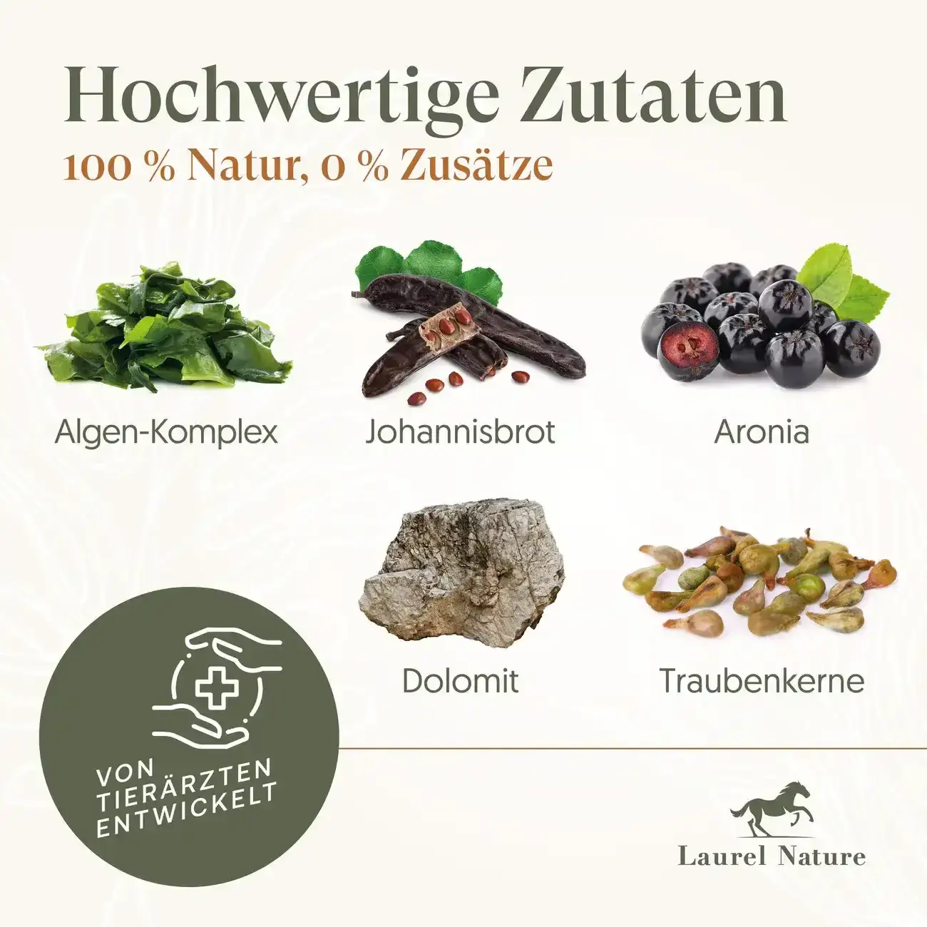 Enthält mehr als 60 Spurenelemente, 21 Aminosäuren und 12 Vitamine, die deinem Pferd im täglichen Leben helfen. Die organischen Alginatkomplexe in der Braunalge ermöglichen eine optimale Aufnahme der Mineralstoffe im Pferdekörper. Dadurch wird die Wirksamkeit um ein Vielfaches gesteigert.