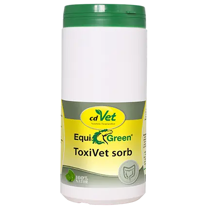 In der Fütterung unserer Pferde gibt es immer größere Barrieren zu überwinden, um eine möglichst naturnahe Fütterung zu gewährleisten. Toxinbelastungen im Grundfutter, sowie die Überversorgung mit Eiweiß, bilden oftmals die Ursachen für Stoffwechselüberbelastungen. EquiGreen ToxiVet sorb enthält hocheffiziente Zutaten, die zur Bindung von Giftstoffen und gleichzeitig zur Entlastung der Leber beitragen können. Der Darm wird dabei unterstützt, die Giftstoffe zu binden und sie anschließend auszuscheiden. So wird schädlichen Stoffen das Eindringen in den Organismus erschwert. EquiGreen ToxiVet sorb ist reich an natürlichen B-Vitaminen, Spurenelementen und essentiellen Aminosäuren. Durch Mannan-Oligosaccharide (MOS) wird die schleimhaltige Schutzbarriere des Darms und dessen unspezifisches Immunsystem unterstützt.